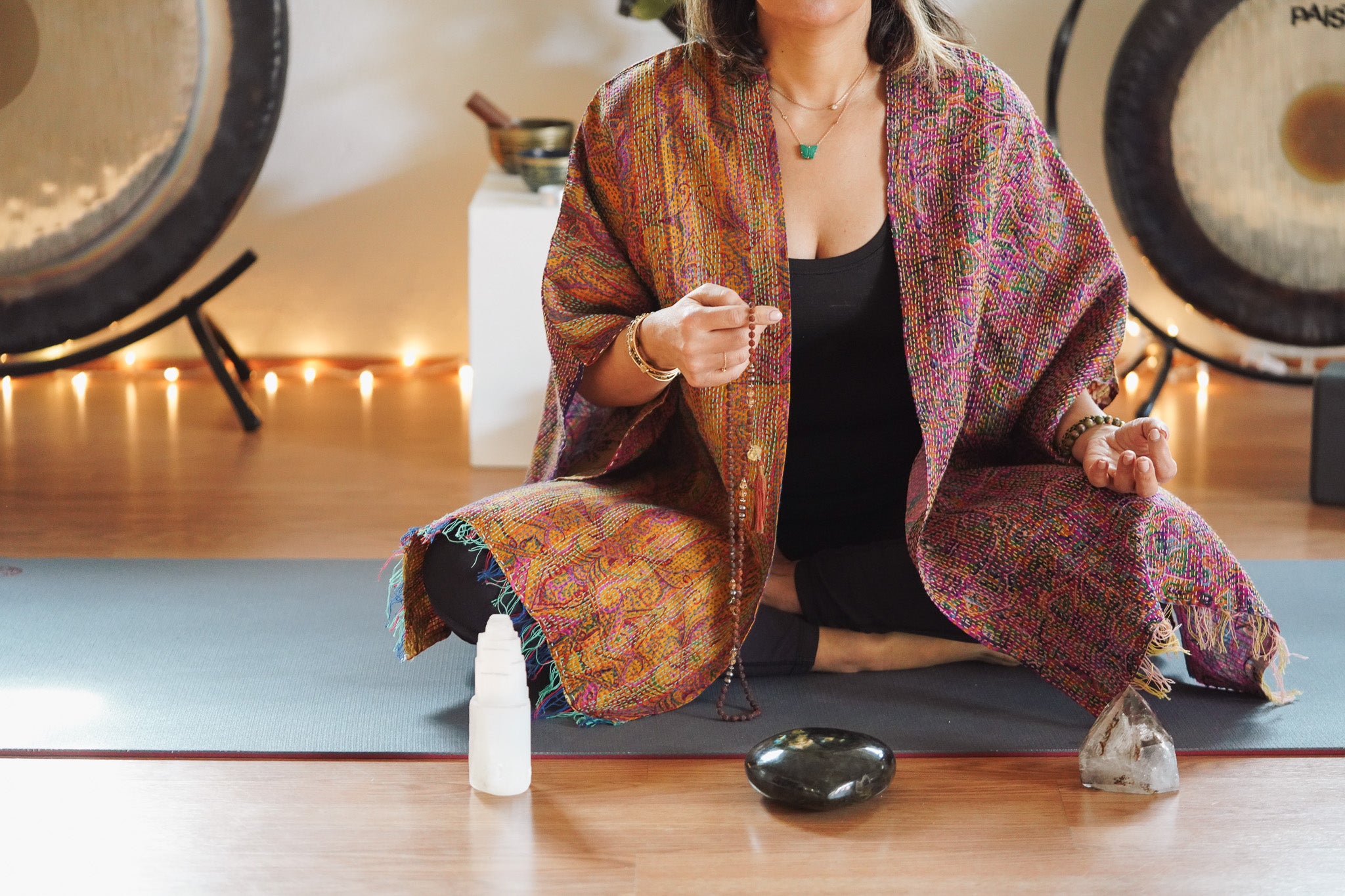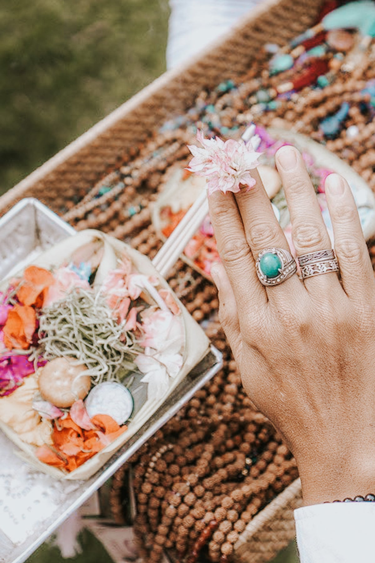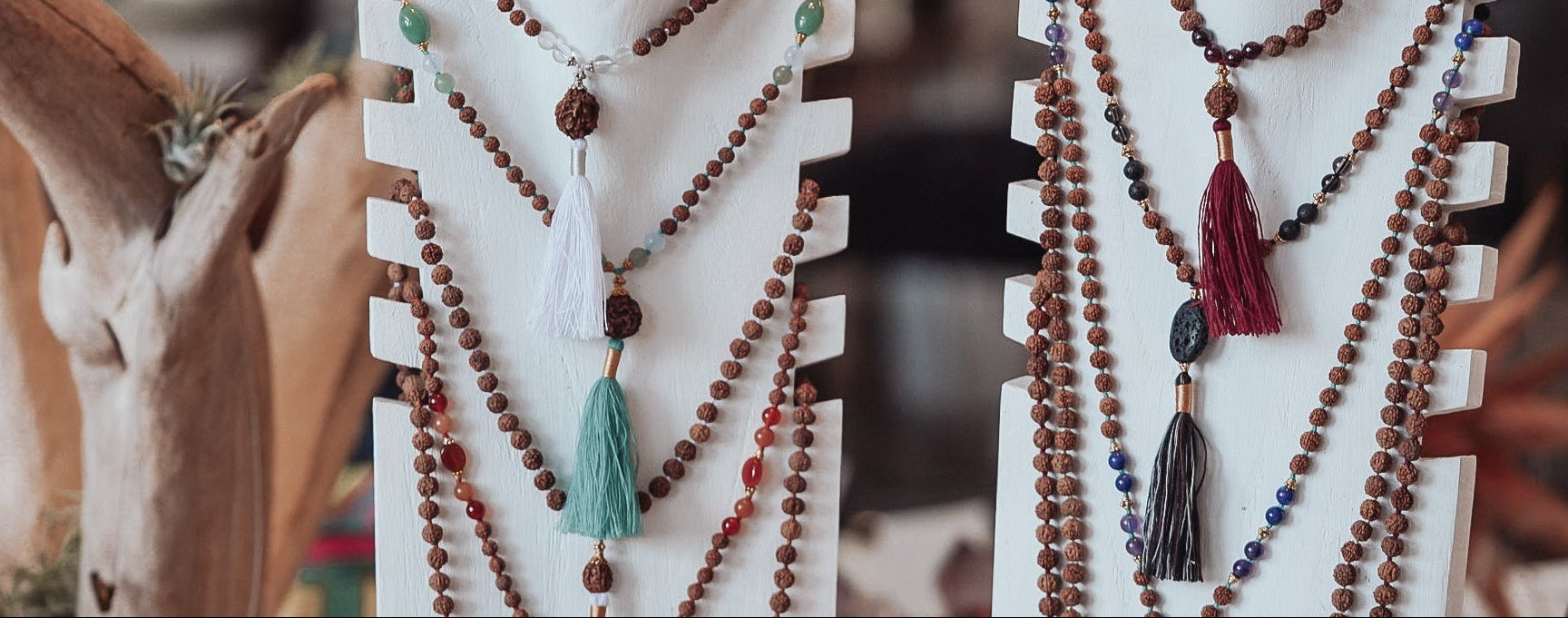 Hand-strung malas, touched by sunlight and intention.